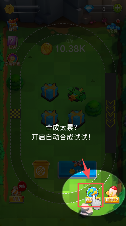 1、当觉得手动合成太累时,点击界面右下角的 “自动” 按钮,即可触发自动合成的功能提示。