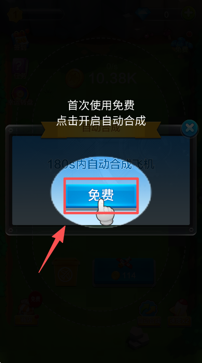 2、在自动合成的弹窗里,点击 “免费” 按钮,就能开启 180 秒的自动合成飞机功能。