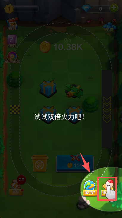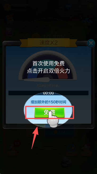 4、在双倍火力的弹窗中,点击 “免费” 按钮,可开启该功能并额外获得 150 秒的加速时间。