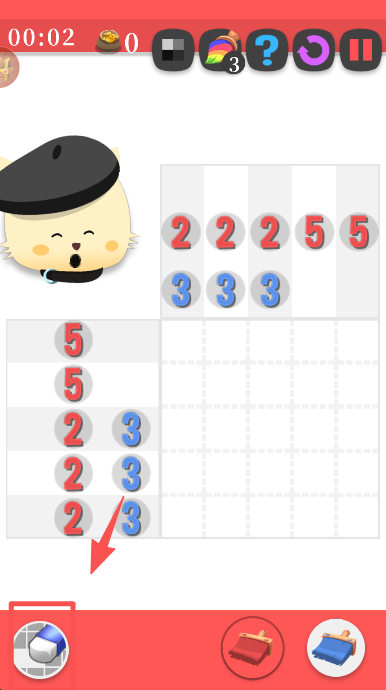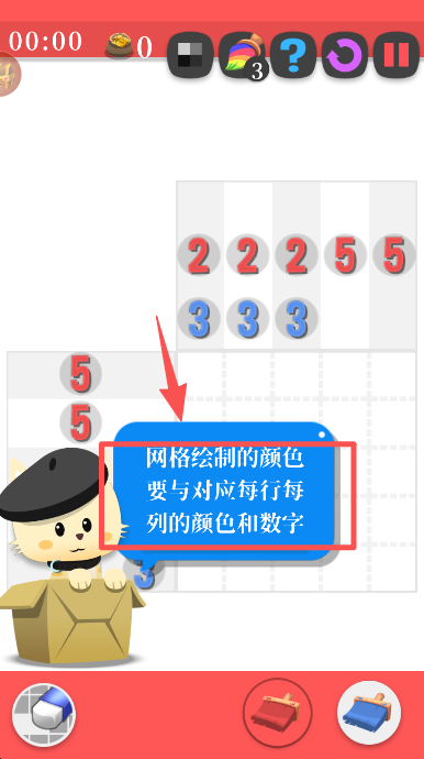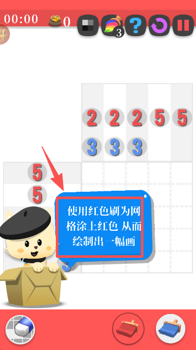 2、进入关卡后,按照提示选择红色画笔,为对应的网格区域涂上红色,开启图案的绘制流程。