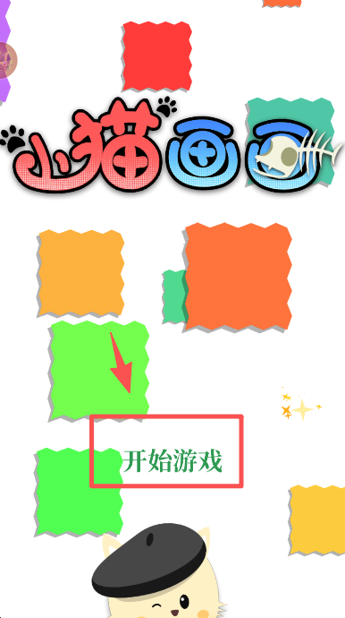 1、在游戏启动界面,找到绿色区域内的 “开始游戏” 按钮并点击,即可进入小猫画画的创作关卡。