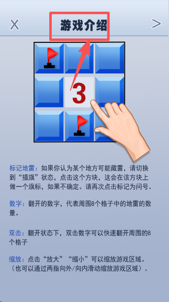 4、继续查看游戏介绍内容,掌握标记雷、数字含义、双击翻格等核心操作规则,以便后续实际排雷。