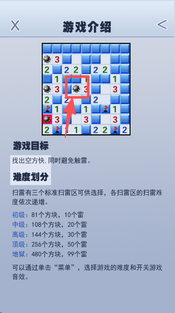 3、进入游戏介绍界面,了解游戏目标是找出空方块同时避免触雷,以及不同难度对应的方块和雷数量。