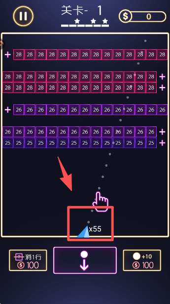 1、核心操作:在屏幕下方通过拖拽调整发射方向,观察预测线,松手即可将弹珠射出,攻击上方砖块阵列。