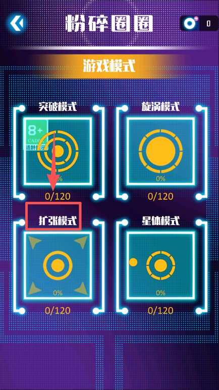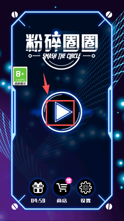 1、在 “粉碎圈圈” 主界面,点击带播放图标的按钮,进入游戏模式的选择页面。