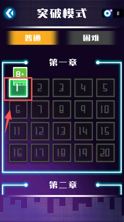 3、在突破模式的关卡页,点击 “第一章” 下的第 1 关,进入该关卡的游戏准备界面。