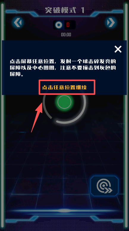 4、查看关卡提示后,点击屏幕任意位置继续,按规则发射球击碎发亮屏障与中心圈。