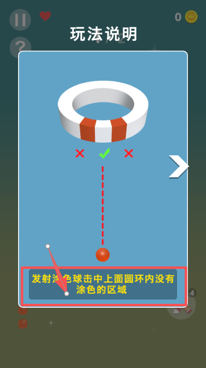4、查看玩法说明:需发射涂色球,击中圆环内未涂色的区域,按此规则开始游戏。