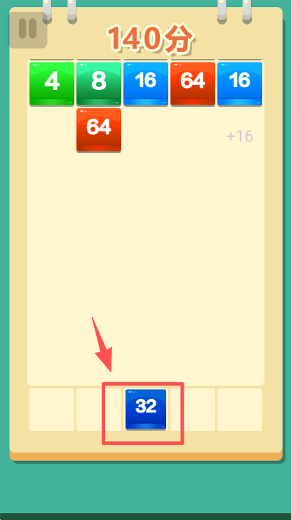 4、看到界面下方的数字 32 方块时,点击对应区域放置它,尝试与相同数字方块合并消除得分。