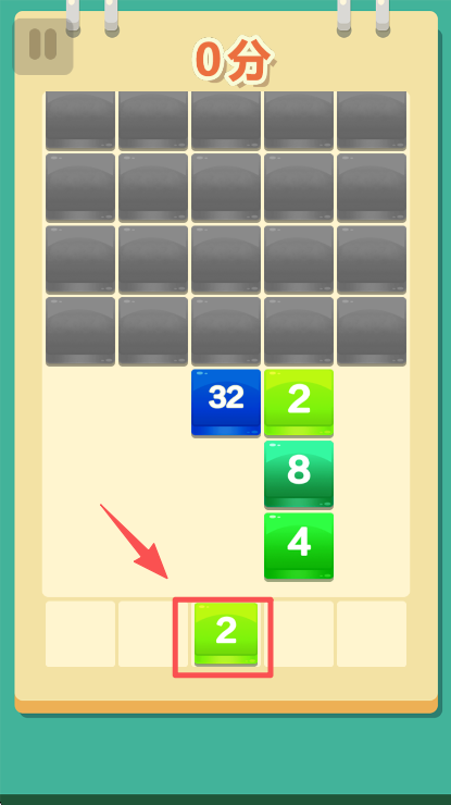 1、在游戏界面中,找到下方的绿色 2 方块,点击对应区域将其放到已有绿色 2 旁,便于后续合并消除。