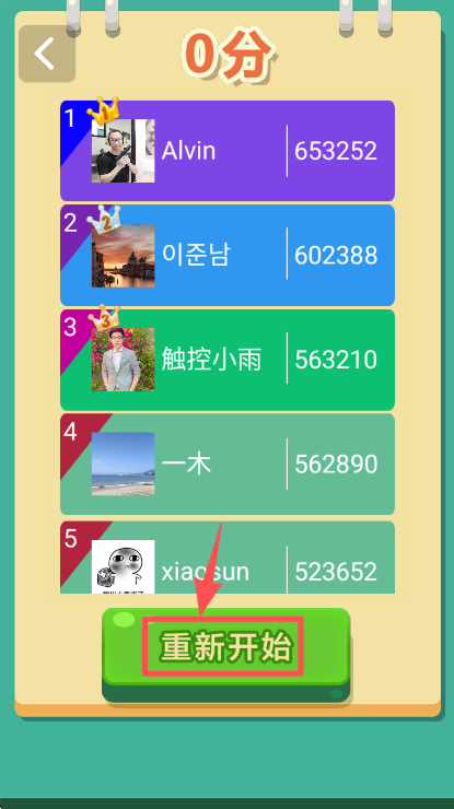 2、处于排行榜界面时,点击 “重新开始” 按钮,回到游戏关卡继续进行方块消除的操作。