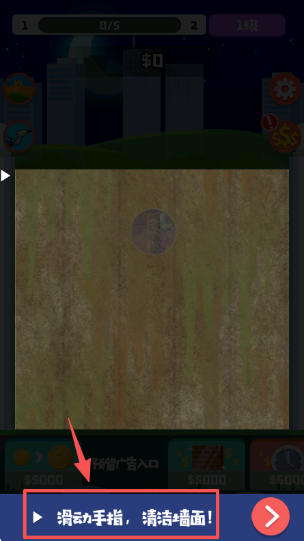 1、在游戏初始界面,按照提示滑动手指,对当前显示的墙面进行清洁操作,推进游戏进程。