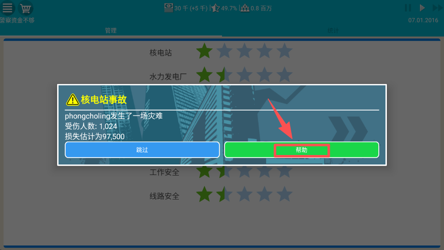 2、出现核电站事故弹窗时,点击 “帮助” 按钮,处理这场灾难事件。