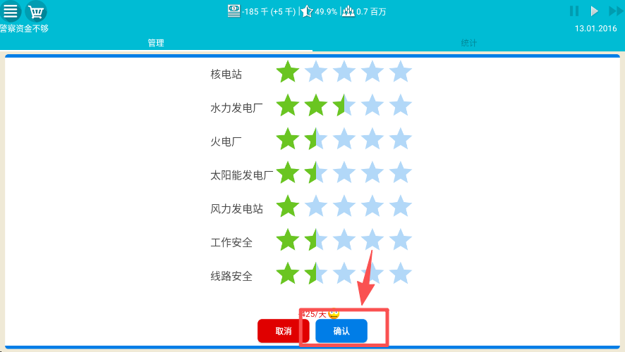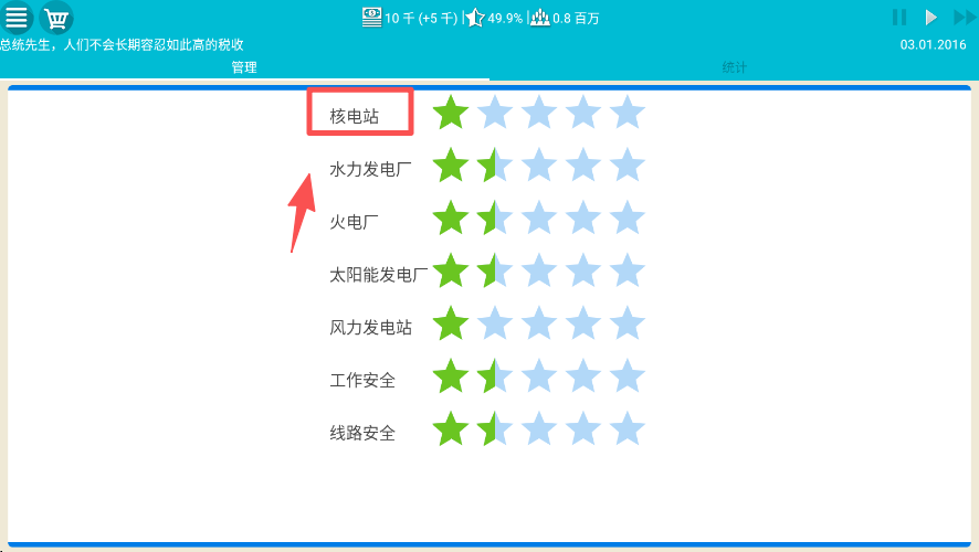 1、在管理界面点击 “核电站” 选项,查看并管理该能源设施的星级状态。