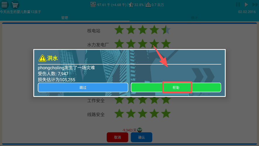 4、遇到洪水灾难弹窗时,点击 “帮助” 按钮,应对此次灾害事件。