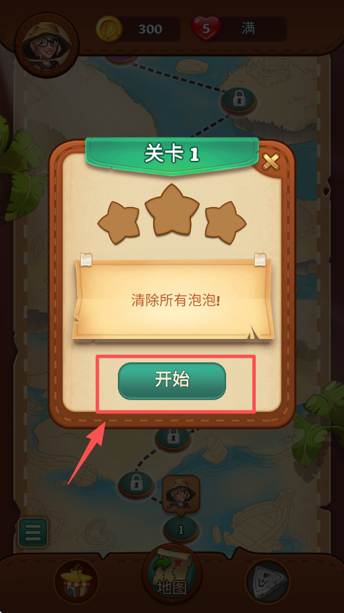 2、在关卡 1 的提示弹窗中,点击 “开始” 按钮,进入该关卡的泡泡消除玩法。