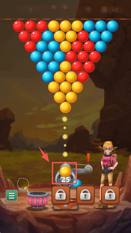 4、在游戏界面,操控炮台瞄准黄色泡泡区域射击,消除对应颜色的泡泡。
