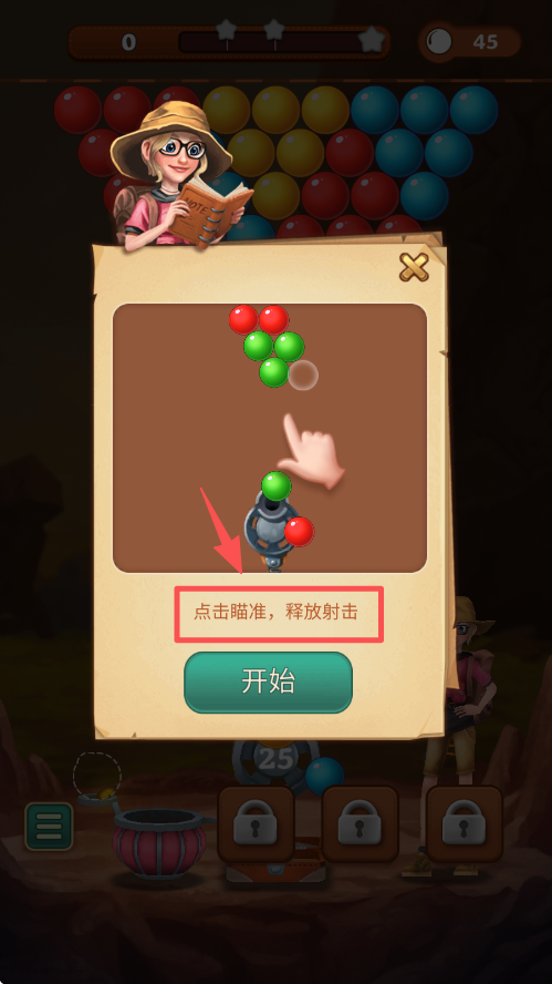 3、查看操作提示后,点击 “开始” 按钮,学习 “点击瞄准、释放射击” 的玩法。