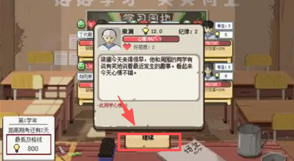 1、在剧情弹窗界面,点击 “继续” 按钮,关闭当前提示并推进游戏流程。