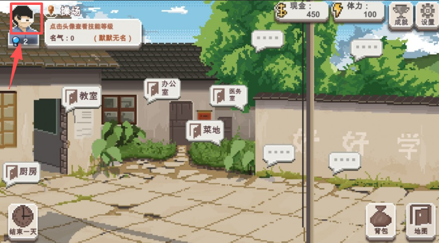 3、在操场场景,点击左上角的头像,查看角色的技能等级等信息。