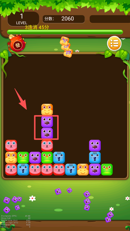 1、找到界面中同图案的方块,如图中紫色方块,拖动连接完成消除来积累分数。