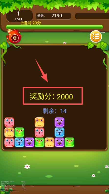 2、消除到一定程度会出现 “奖励分” 提示,获得额外分数后继续推进关卡进度。