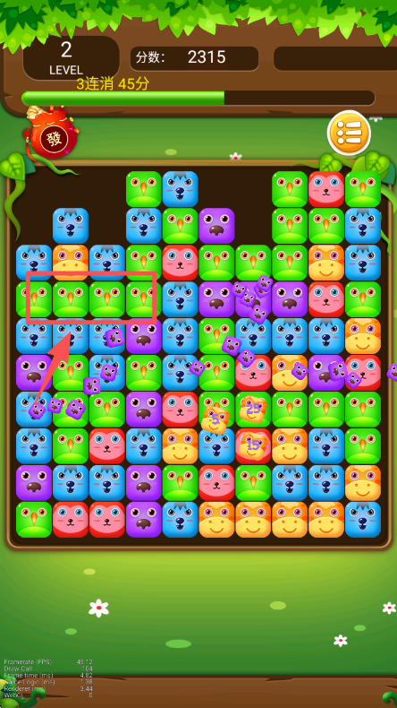 3、进入新关卡后,优先找多个同图案方块,如图中绿色方块,连接消除拿更高分。