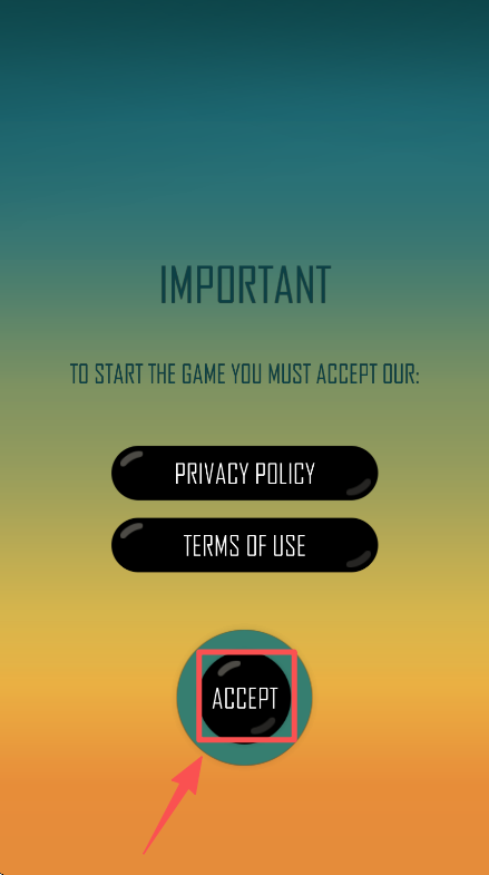 1、在游戏初始的政策确认界面,点击下方 “ACCEPT” 按钮,同意隐私政策和使用条款以进入游戏。