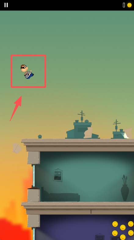 4、在下落过程中,控制小偷移动到建筑的不同区域,尽可能收集场景中的金币道具。