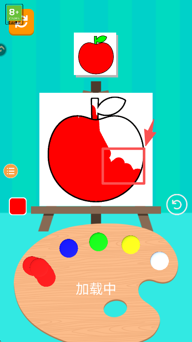 1、在填色界面,用红色颜料填充画布上苹果轮廓的主体区域,逐步覆盖空白部分。