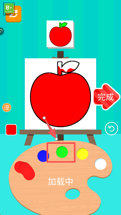 3、用绿色颜料完成果柄与叶子的填色后,点击界面右侧的 “完成” 按钮提交作品。