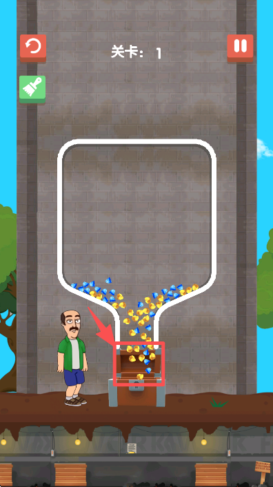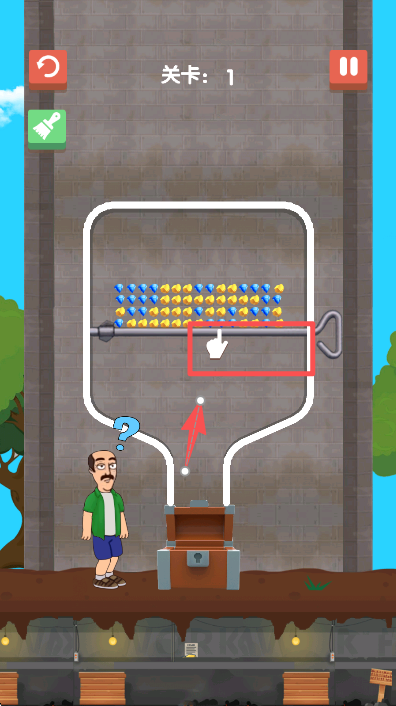 3、在关卡 1 中,按照手指提示点击管道上的开关,打开通道让金币等物品向下流动。
