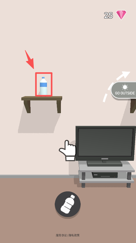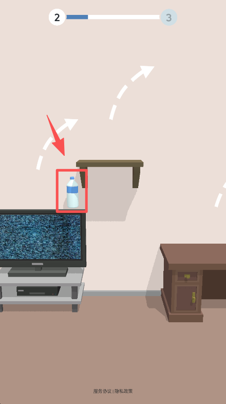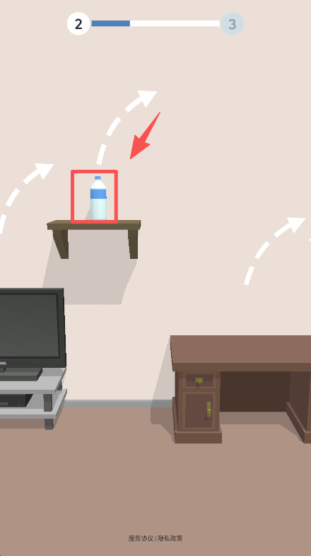 1、点击桌上的水瓶,触发其弹射机制,让水瓶按照轨迹向目标区域移动推进关卡。