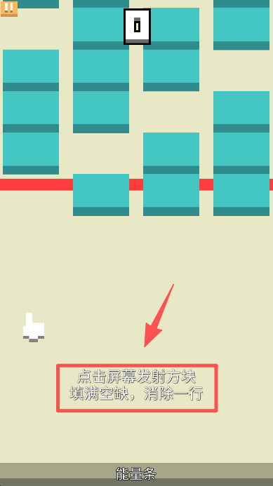 2、进入游戏关卡后,按照提示点击屏幕,发射方块填补空缺区域,完成一行填充来消除该行。