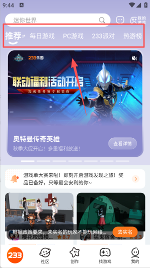 1、在首页点击顶部 “推荐” 等分类标签,切换查看对应板块的游戏及活动内容。