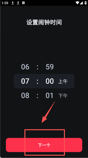 2、选择“下一个”按钮,设置闹钟响起的具体时间。