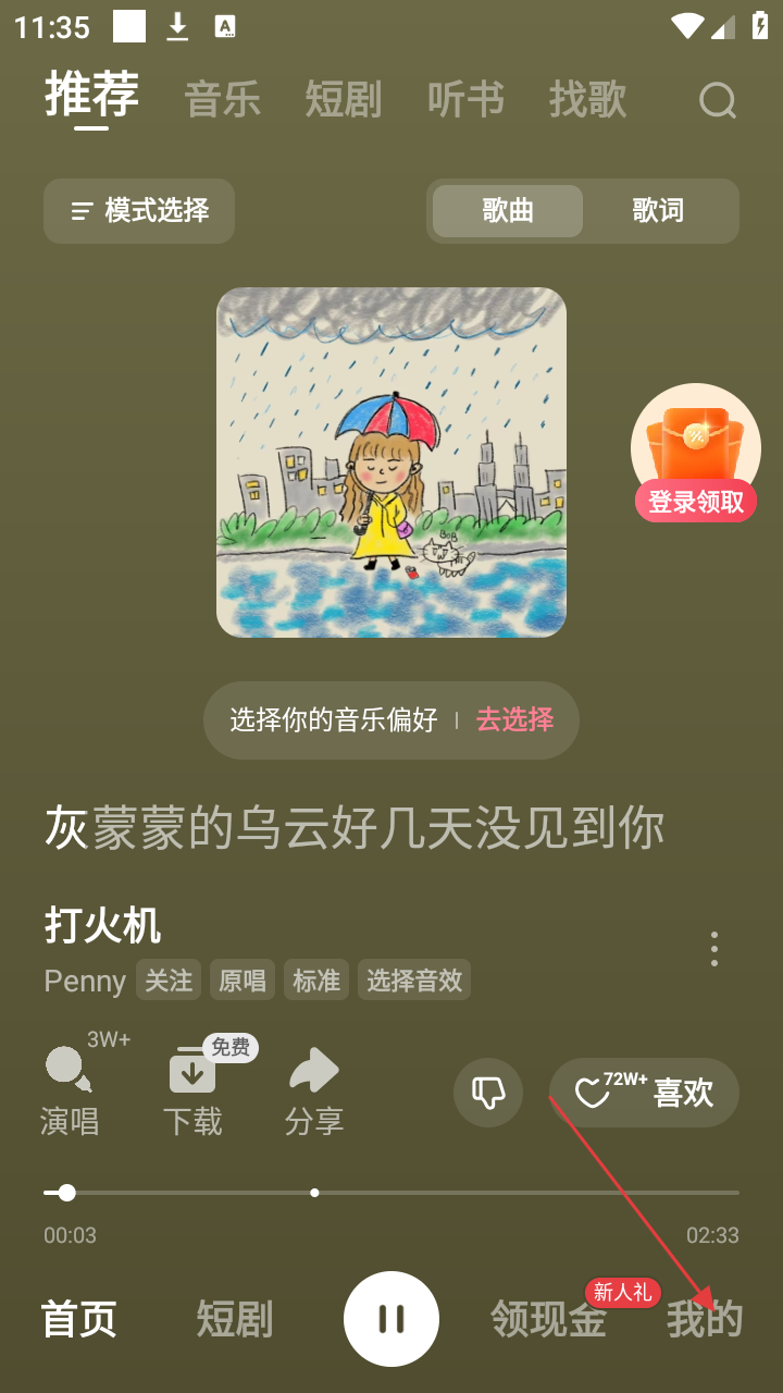 1、进入番茄畅听音乐版,在音乐播放页面,可进行演唱、下载、分享等操作,若要进入个人相关页面,点击右下角【我的】。