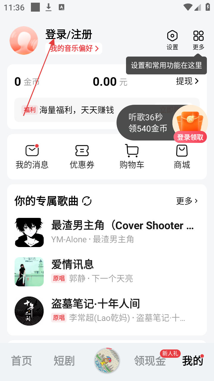 2、进入【我的】页面后,点击【登录/注册】,可进行账号登录或注册操作,还能查看专属歌曲等内容。