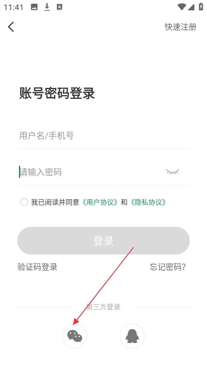 4、在登录页面,可选择第三方登录方式,如微信登录,点击微信图标,按提示完成授权即可登录。