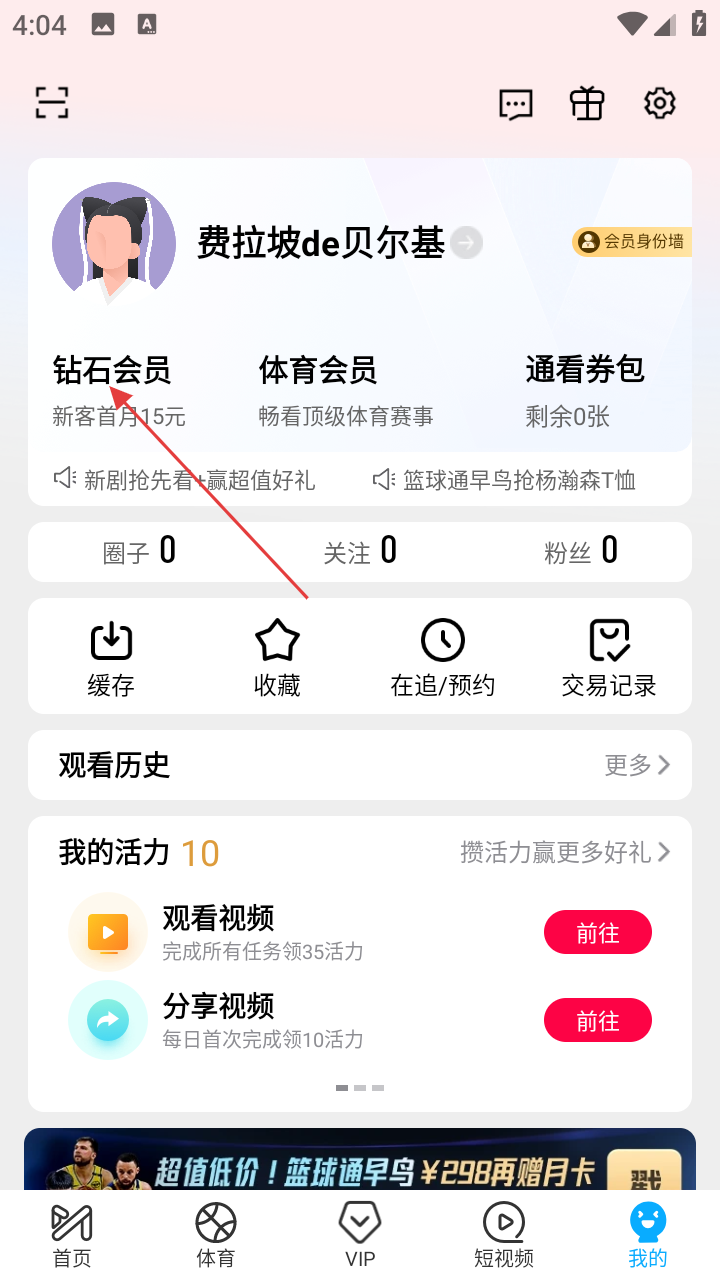 2、在个人页面,能看到【钻石会员】【体育会员】等选项,点击【钻石会员】可进入会员中心页面。