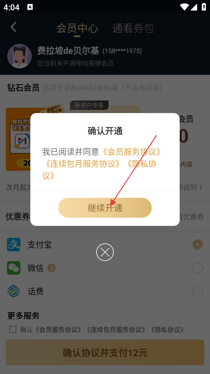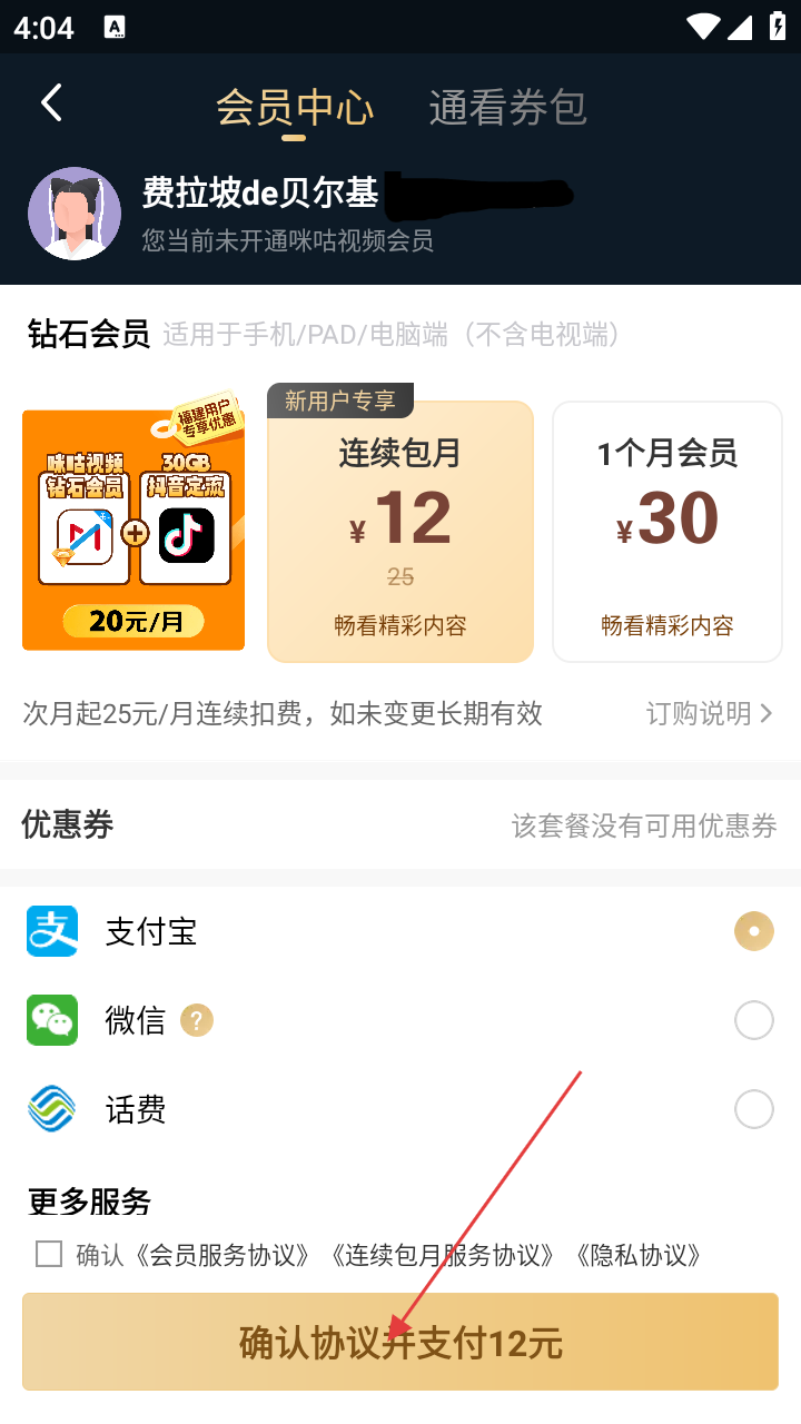 3、进入会员中心页面,有不同钻石会员套餐,选择后点击【确认协议并支付12元】可进入确认开通环节。