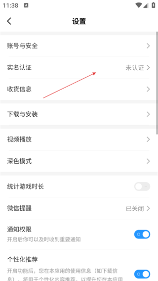 3、设置页面中,选择【实名认证】选项(当前状态为“未认证”),进入认证页面。