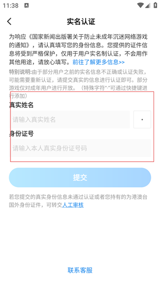 4、在实名认证页面,依次填写真实姓名、身份证号,确认信息无误后点击【提交】,完成实名认证流程。