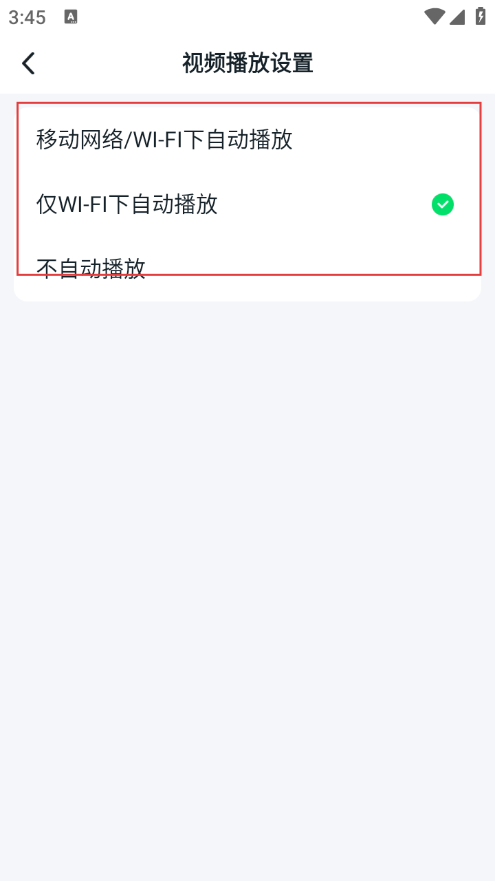 4、在视频播放设置页面,可根据需求选择【移动网络/WI-FI下自动播放】【仅WI-FI下自动播放】【不自动播放】其中一种播放方式。