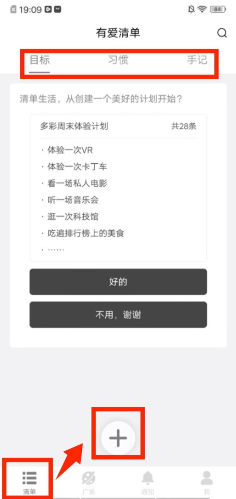 2、切换到清单页面,在 “目标”“习惯” 等分类下,点击底部 “+” 按钮,可创建新的计划清单。