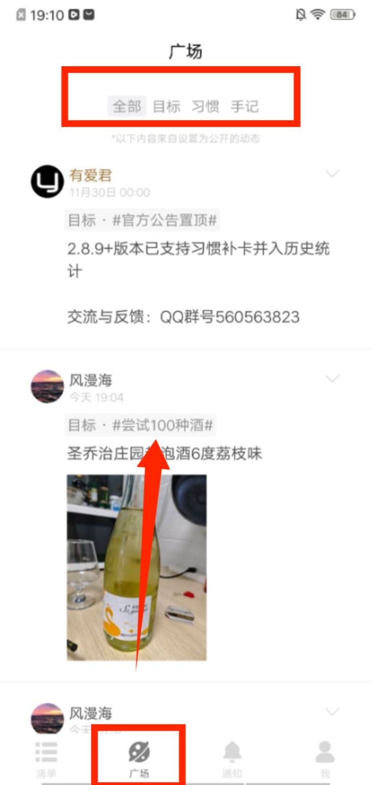 3、打开广场页面,通过 “全部”“目标” 等标签筛选,能浏览其他用户公开的动态内容,参与交流。