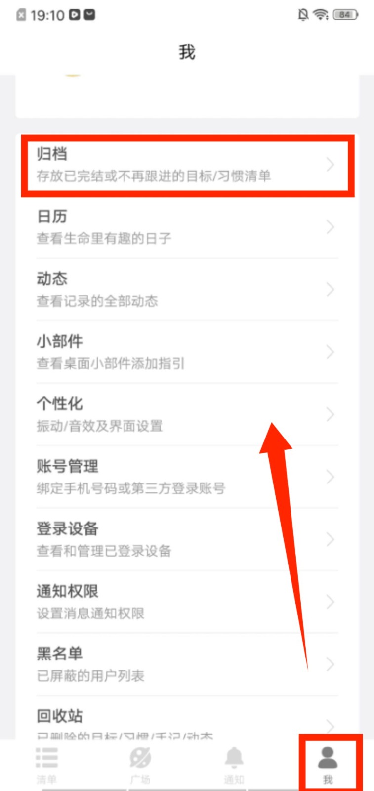 4、进入 “我” 的页面,点击 “归档” 选项,可存放已完结的目标或习惯清单,整理个人记录内容。