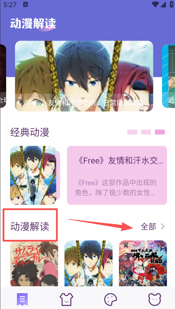 1、在软件界面中,找到 “动漫解读” 板块,点击其右侧 “全部”,可浏览更多动漫解读内容。
