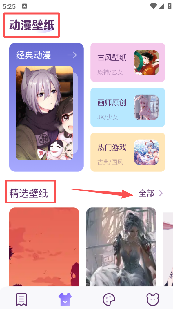 2、切换到 “动漫壁纸” 页面,点击 “精选壁纸” 旁的 “全部”,能查看各类精选动漫壁纸。