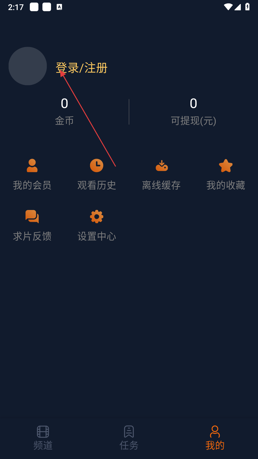 2、在【我的】页面,点击【登录/注册】,可进入登录注册界面,以便使用会员等功能。